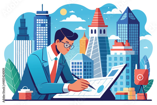 Architectural building plans and skyscrapers beside a personal profile showcasing ratings. Ideal for job hunting, recruitment, urban development, design evaluation, professional feedback, career