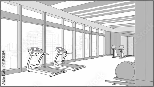Gym without people during the virus epidemic against the backdrop of the urban landscape in the large windows.Training equipment: an exercise bike, a barbell, a water cooler and a fitness ball.Vector