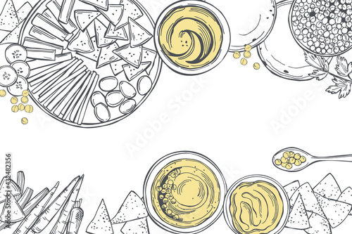 Hummus cooking and ingredients for hummus.   Vector background.