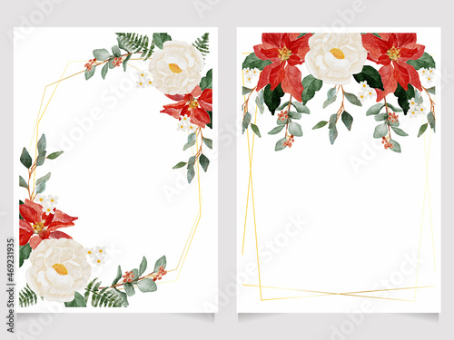 Christmas festive set with party invitation templates decorated with seasonal vegetation, poinsettia, tree branches, holly leaves and berries, decorative winter frames