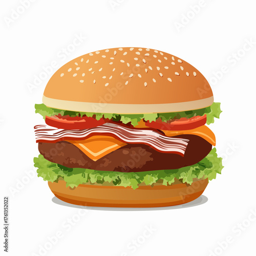 Vector Fast Food Hamburger Classic Burger American Cheeseburger with Lettuce Tomato Onion Cheese Beef and Sauce isolated on white Background