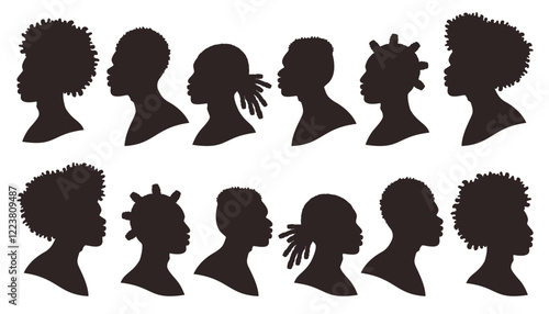 African American men set. Hairstyle man isolated. Profile silhouette men. Hand drawn Profile faces collection. Silhouette man icon. Vector flat illustration