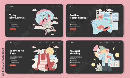 Active seniors lifestyle concept with diverse outdoor and indoor activities.eps