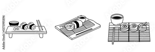 Asian Cuisine Culinary Array: A minimalist illustration showcases a delicious assortment of traditional Asian culinary delights. perfect for food-related projects.