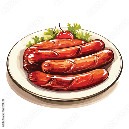 Vector illustration of sausage food on a fork. Smoked sausage, grilled sausage, barbecue, steak, cooking, food menu. Isolated blank image on white background. For poster, sign, card and advertisement.