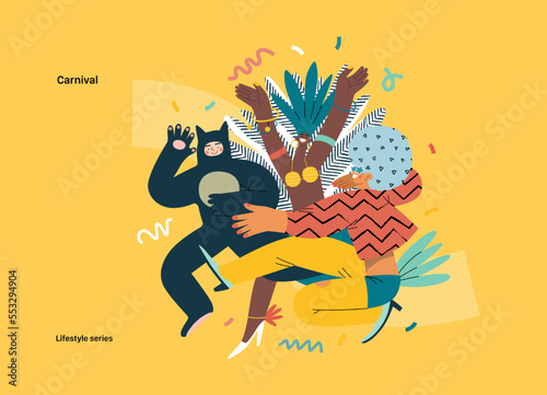 Lifestyle series - Carnival - modern flat vector illustration of masked people dancing together, taking part in the costume carnival procession. People activities concept