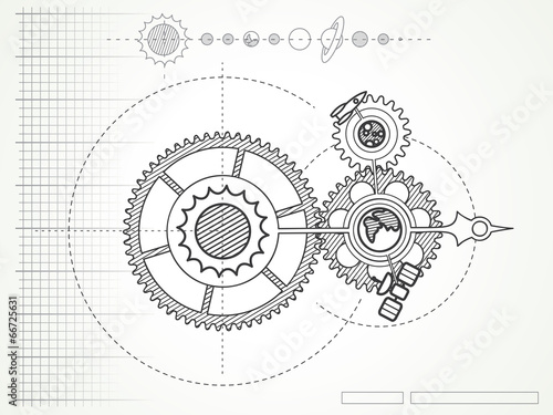 Detailed mechanical sketch featuring gears wheels and intricate clockwork components in a vertical arrangement