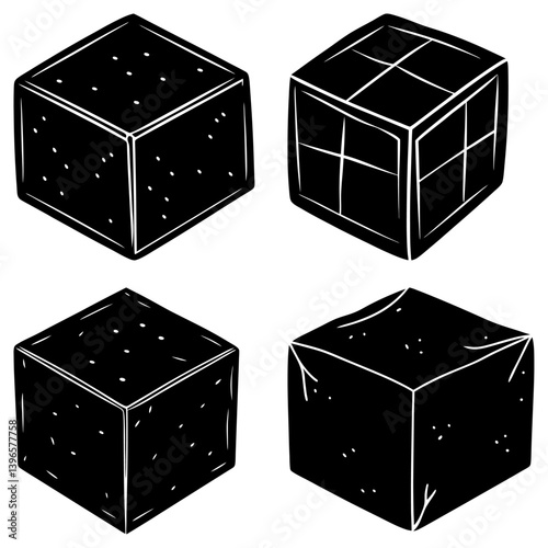 Three Tofu Pieces Light Yellow Color and Black Outline Isolated on Plain White Background
