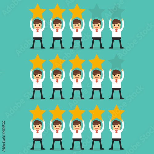 five star rating illustration with concept of businessman puts a star to give five star rating, business people placing 5 stars rating flat with flat style, client holding review stars concept