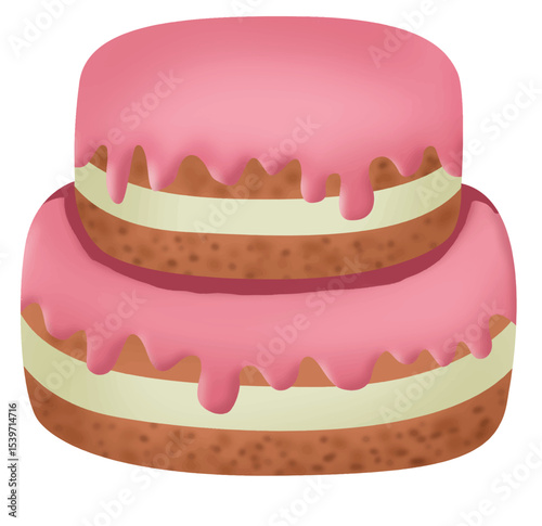 Hand-drawn tiered pink cake with cherries and frosting, sweet dessert illustration