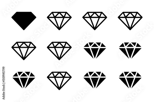 Collection of stylized diamond icons and symbols, presented in a clean, minimalist line art style, showcasing various facets and cuts for a luxurious and elegant aesthetic, perfect for jewelry