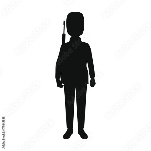 The drawing of a soldier of the British royal guard in a red uniform during the service. Drawing in color and simple line.