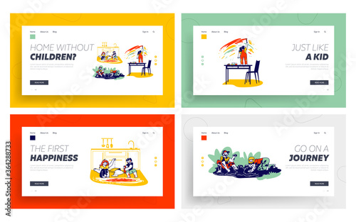 Dirty Kids Landing Page Template Set. Naughty Children Characters Make Mess, Boys and Girls Playing in Puddle, Fooling at Home Pouring Flour on Floor, Bad Behaviour. Linear People Vector Illustration