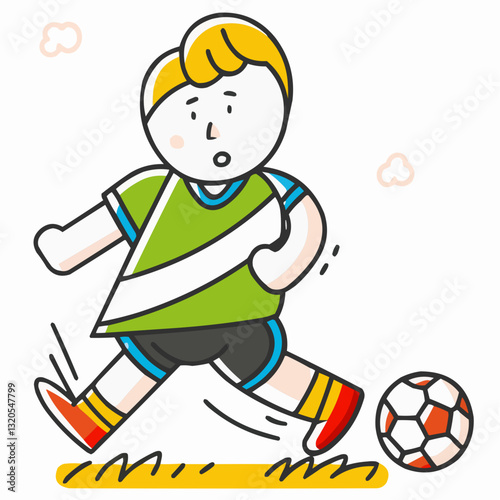 Illustration of a boy wearing red and blue jerseys kicking a soccer ball. Vector Illustration.