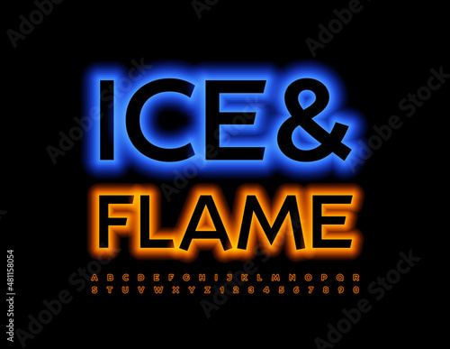 Vector neon template Ice and Fire. Flaming light Font. Electric glowing Alphabet Letters and Numbers set