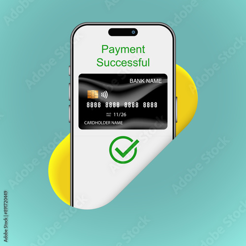 Realistic 3D Smartphone and Credit Card in a Hole Mockup. Successful Wireless Payment Processing for Online Shopping. Vector.