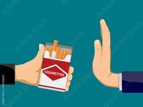Male throwing pack of cigarettes in trash. Stop smoking and healthy lifestyle concept. Colorful vector illustration