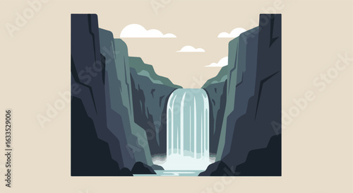 A serene waterway flowing between majestic, green-covered rocky cliffs in a flat vector style.