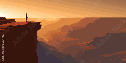 Stylized illustration of a vast red rock canyon landscape with steep cliffs and a winding gorge under a cloudy sky.