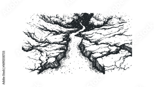 A monochrome drawing of a train on a bridge spanning a gorge with detailed rock formations and linear style