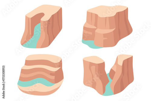 Topographic Contour Landscapes. Isometric vector illustration set topographic map contour elevation: desert canyon ridges,
