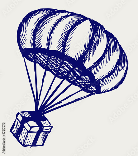 Present and parachute falling from the sky. Doodle style
