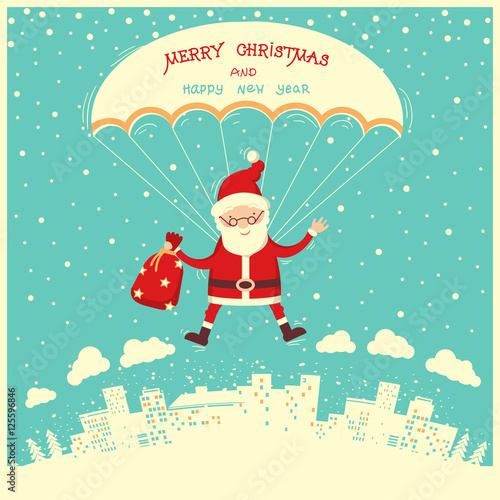 Merry Christmas! Funny Santa Claus flying on parachute with sack of gifts. Christmas card in cartoon style.