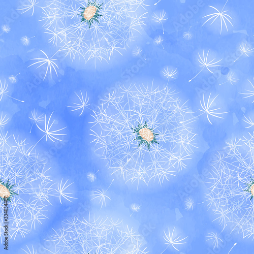 Vector seamless pattern with airy white dandelions and flying fluffs. Summer spring floral background with watercolor texture.