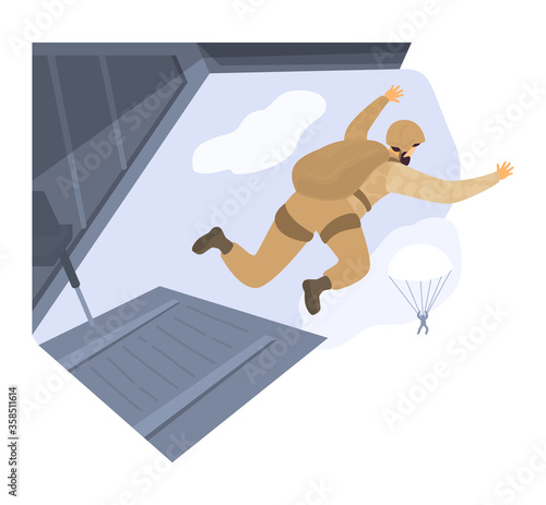 Paratrooper jump parachute combat aircraft, character male soldier combat mission isolated on white, flat vector illustration. Battle air flight aerial vehicle, airdrop serviceman martial art.