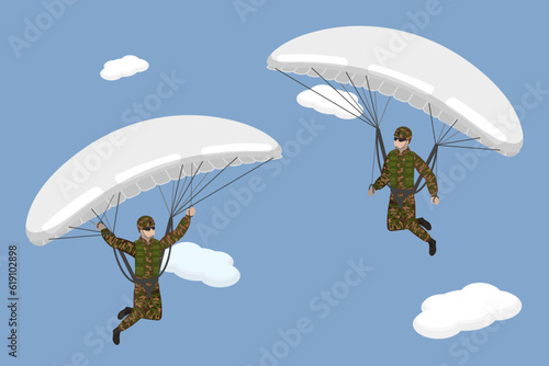 3D Isometric Flat Vector Conceptual Illustration of Paratroopers, Skydivers in Khaki Military Uniform