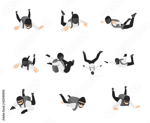 Man Parachutist Skydiving and Free-falling in the Air Descenting on the Earth Vector Set. Flat vector illustration isolated on white background