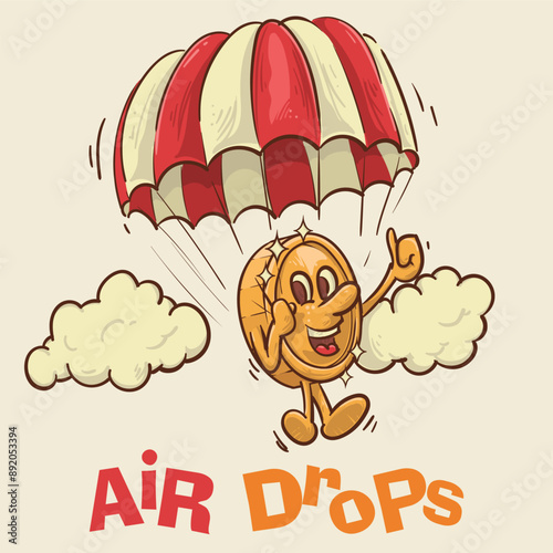 air drops concept. shine coin mascot wear parachute flying concept.vintage style money mascot cartoon character vector illustration