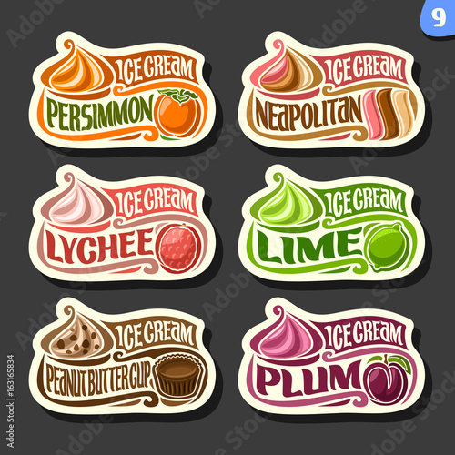 Vector set of fruit Ice Cream labels: 6 logos of different flavor italian icecream dessert, six art icons with title - ice cream, on black background, soft mixed gelato ice cream served of swirl cone.