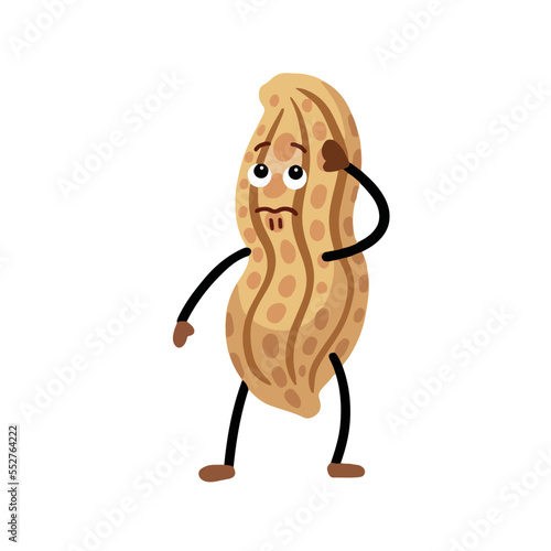 Peanut vector character with confused face looking upwards and body expression mascot. Food illustration with funny cartoon simple flat style isolated on plain background.