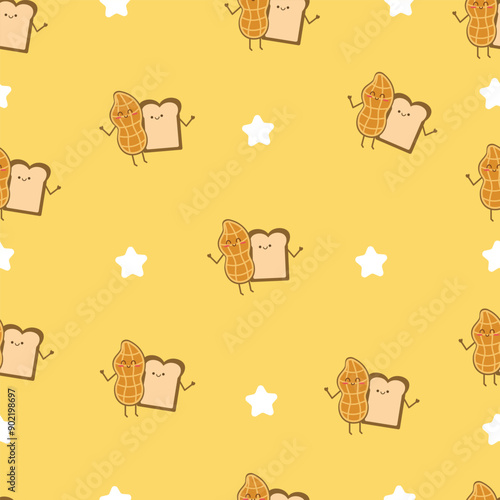 Cute seamless pattern with peanuts,toast, and star in kawaii style. Perfect for wrapping paper, packaging, textiles, wallpaper, clothing, posters, banners, etc. Vector cartoon illustration.