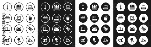 Set Bungee, Gymnastic rings, Pool with balls, Shovel toy, Sand bucket, Shooting gallery, Badminton shuttlecock and Horizontal bar icon. Vector