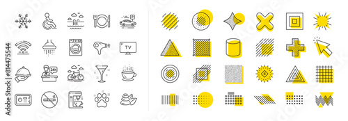 Wi-Fi, Air conditioning and Coffee maker machine. Design shape elements. Hotel service line icons. Spa stones, swimming pool and bike rental icons. Hotel parking, safe and shower. Vector