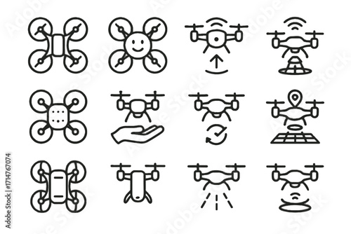 Vector art of a diverse collection of drone icons representing various features and applications isolated on white background