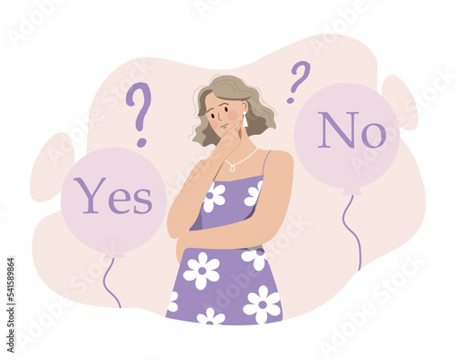 Yes or No. Woman evaluates options and makes decision. Metaphor of logical thinking and uncertainty. Poster or banner for website. Young girl chooses lifepath. Cartoon flat vector illustration