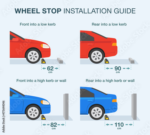 Wheel stop installation guide. Distance between wheel stops and kerb or wall. Flat vector illustration template.