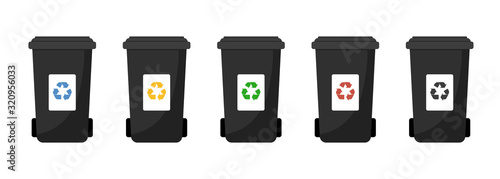 Different colored recycle garbage bins vector illustration, Waste management concept.  Separation of waste on garbage cans. Sorting waste for recycling. Vector illustration