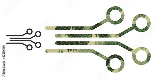 Camouflage low-poly mosaic electrical connectors icon. Low-poly electrical connectors icon is combined with random camouflage colored triangles. Vector electrical connectors icon in khaki army style.