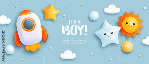Baby shower banner, pink or blue color. It s a girl, boy text. Gender reveal party celebration. Design for he or she birth poster, invitation card. Hang flag garland. 3D bunting, confetti mockup.