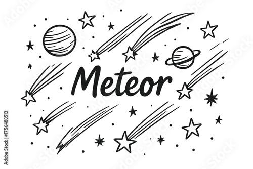 Meteoric Skies. Hand-drawn meteor shower with shooting stars and planets, center word “Meteor” in black and white isolated