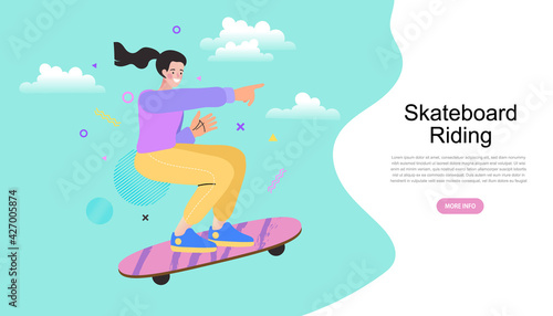 Happy cute young skater woman riding on her skateboard. Women day card. Urban citizen character vector illustration.