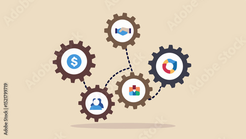 Vector illustration of puzzle icons—symbols for collaboration, personal growth, teamwork, problem-solving, and technology integration in strategic development reference