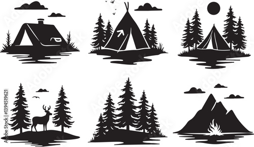 Hiking and camping silhouette set, vector illustration of trekkers, tent, trees, rocks, outdoor adventure poses, nature exploration concept, wilderness travel design