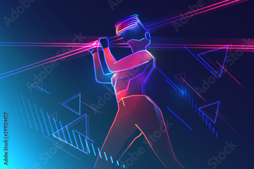 Virtual reality gaming. Man wearing vr headset and using light swords in abstract world. Vector illustration