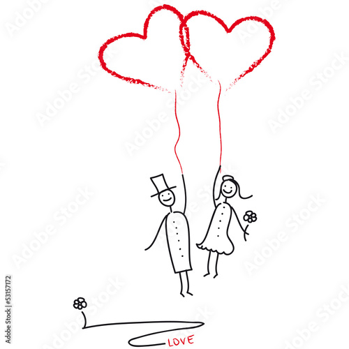 Brautpaar mit Herzluftballon, Glücklich verheiratet und bereit für die Flitterwochen, Strichfigur