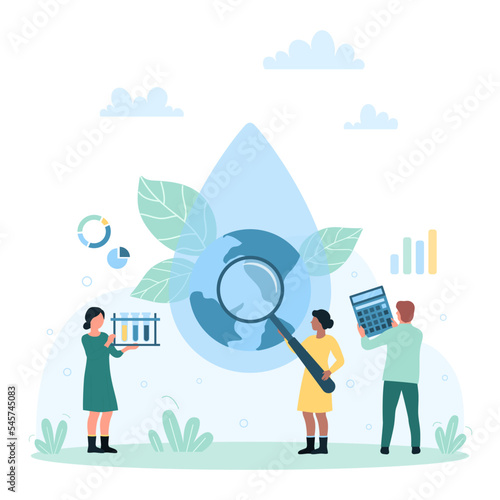 Water quality research and control vector illustration. Cartoon tiny people looking through magnifying glass at blue drop with Earth globe inside, studying microbiology and chemistry of water solution